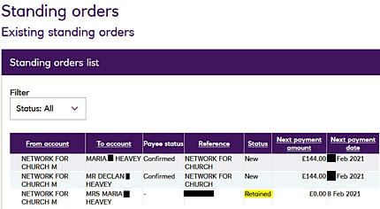 Last February, no sooner had Declan set up online two new standing orders on the Network for Church Monitoring account than he discovered that a standing order had been "Retained" by National Westminster Bank (NatWest) after final payment earlier that month (highlighted in yellow above). He was subsequently informed by NatWest that this could only have happened because they were upholding a request in this regard (no longer available on their systems), but Declan retains proof that he did not request that the details of one of those earlier standing order instructions be retained on their systems following the final payment. His email to NatWest Customer Service and Operations almost four months ago on this issue has been acknowledged but not responded to: